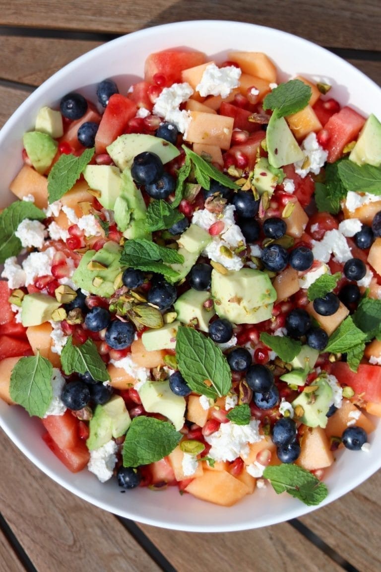 Her får du en opskrift på en skøn og virkelig nem tilbehørssalat med alt muligt godt. Salaten består af vandmelon, cantaloupe melon, avocado, blåbær, granatæble, fetaost, toppet med mynte og pistacie nødder. En masse lækre smage der bare spiller mega godt sammen. Jeg har brugt en udstikker til melon og avocado – har du ikke sådan en, kan du selvfølgelig sagtens blot skære det ud i tern. I indlægget her er der to versioner af salaten. Egentlig helt ens opskrifter. Den ene er bare udhulet med melonske, mens den anden er skåret normalt.