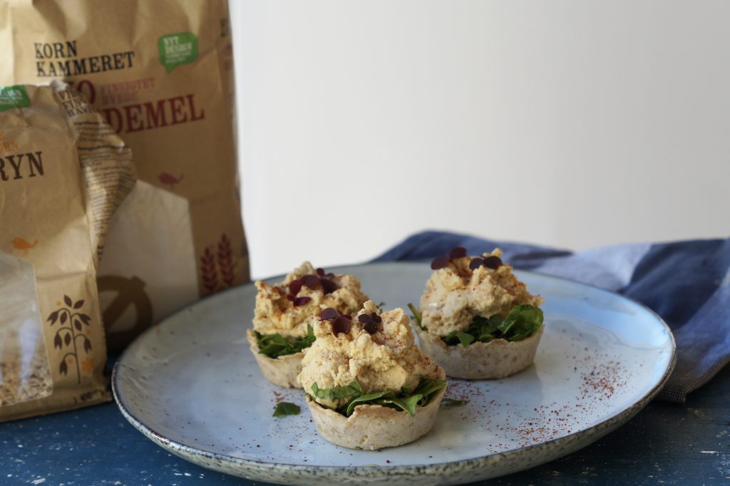 - Top 3 af de små bunde med en stor klat hummus. Hæld lidt olie over og drys med lidt paprika.