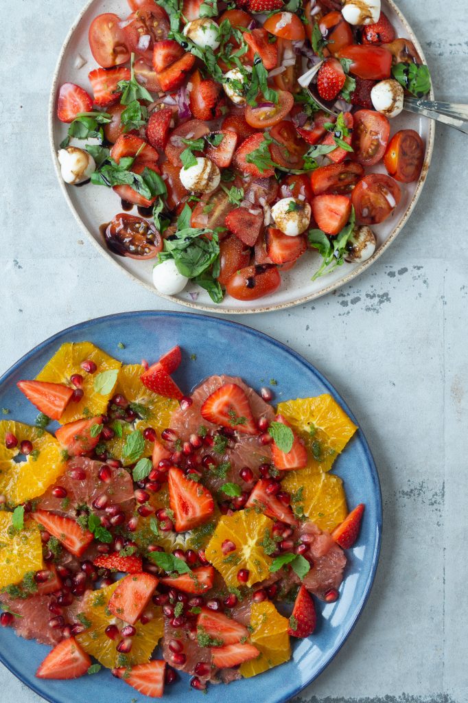 Den anden salat på billedet er en tomatsalat med jordbær, den smager virkelig også sommerligt og skønt. Den laver jeg nærmest hver dag i sommermånederne, det er i hevet fald flere gange om ugen. Men nu skal denne citrussalat med myntesukker da virkelig også på bordet ofte denne sommer. Her får du lidt flere sommersalater.