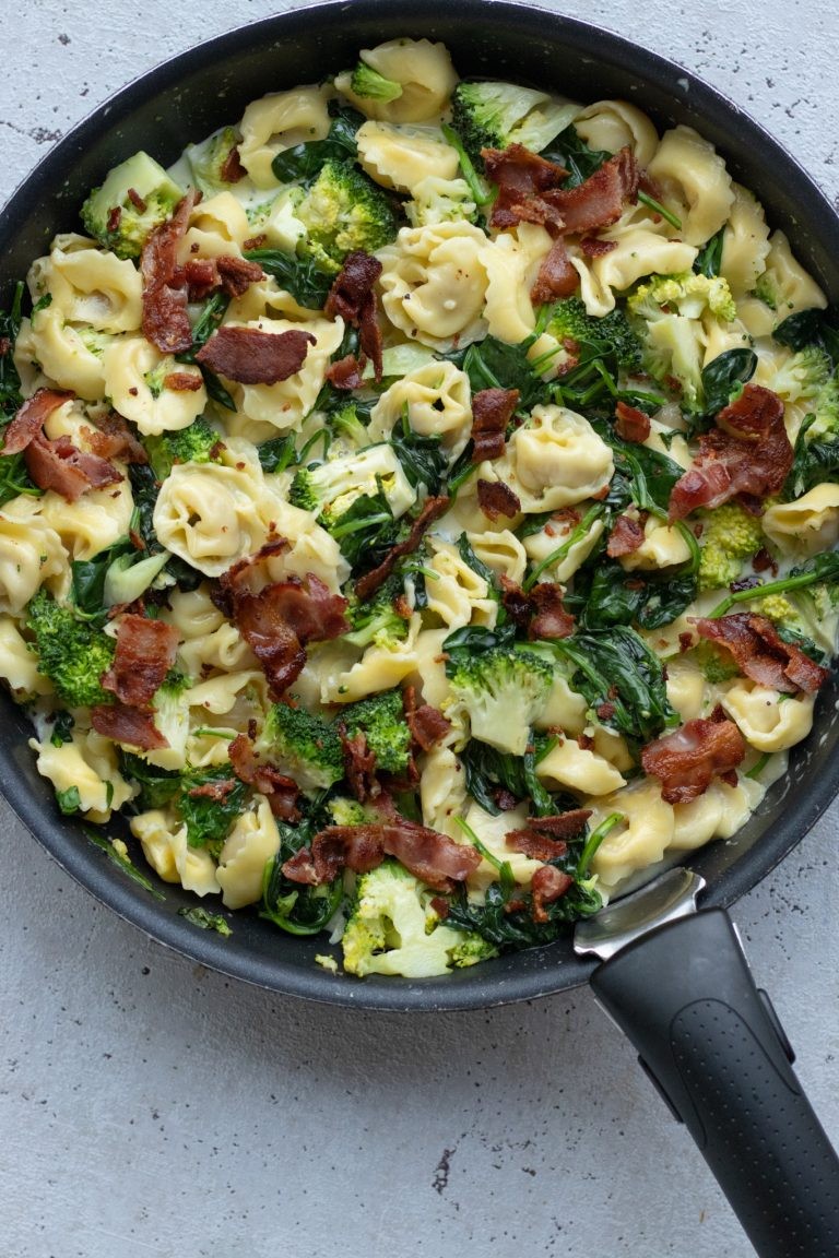 Nem pastaret med masser af broccoli og også godt med spinat. Her har jeg brugt fyldte pastaer og toppet med sprødstegt bacon