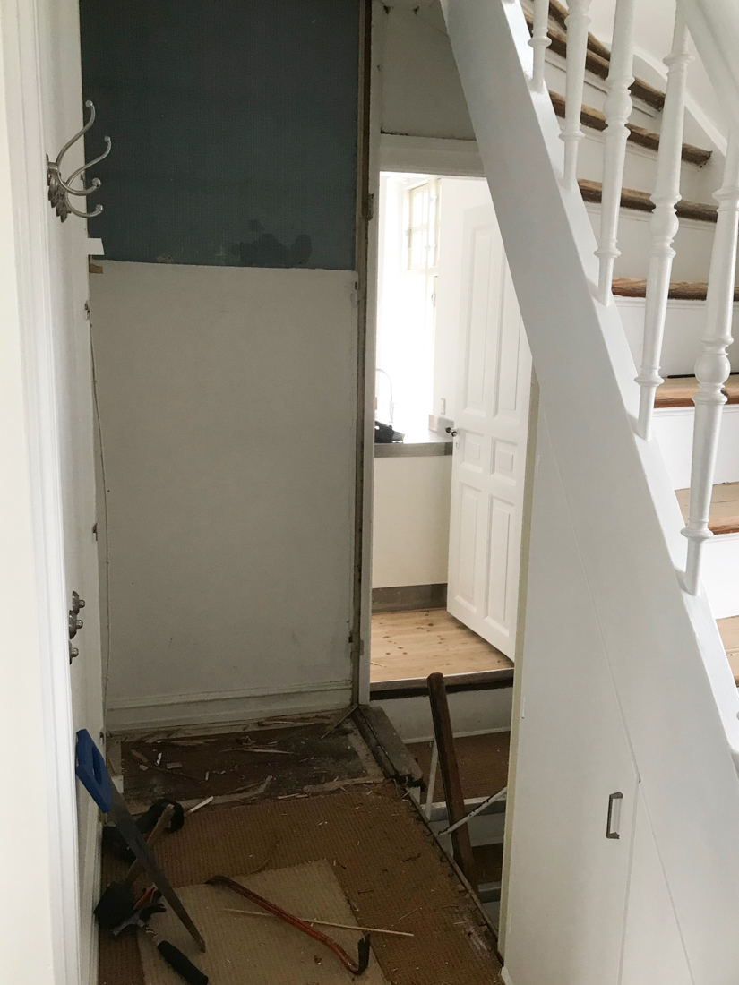 Som man kan se var gangen lukket af, så man ikke kunne gå ned i kælderen. Da vi fik væltet skabet for enden af gangen, kan man se ind til køkkenet – hvor man nemlig gik ned til kælderen. Vi væltede desuden skabene under trappen, for at få en mere åben trappe, hvor man ikke skulle dukke sig og banke hovedet ind hele tiden