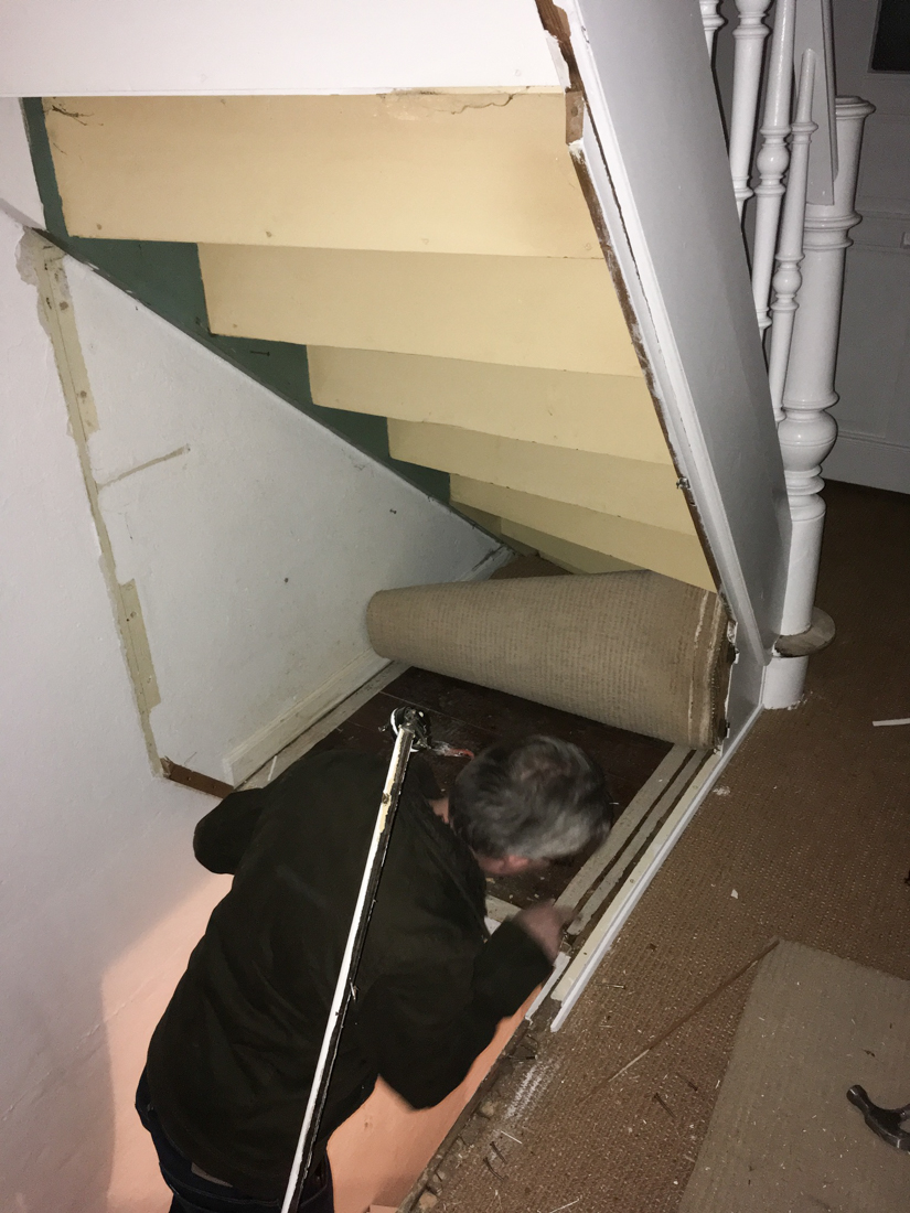 - Nu har vi fjernet gulvtæppet i gangen og på trappen ned til kælderen, og heldigvis var der det fineste trægulv nedenunder – som er blevet slebet.