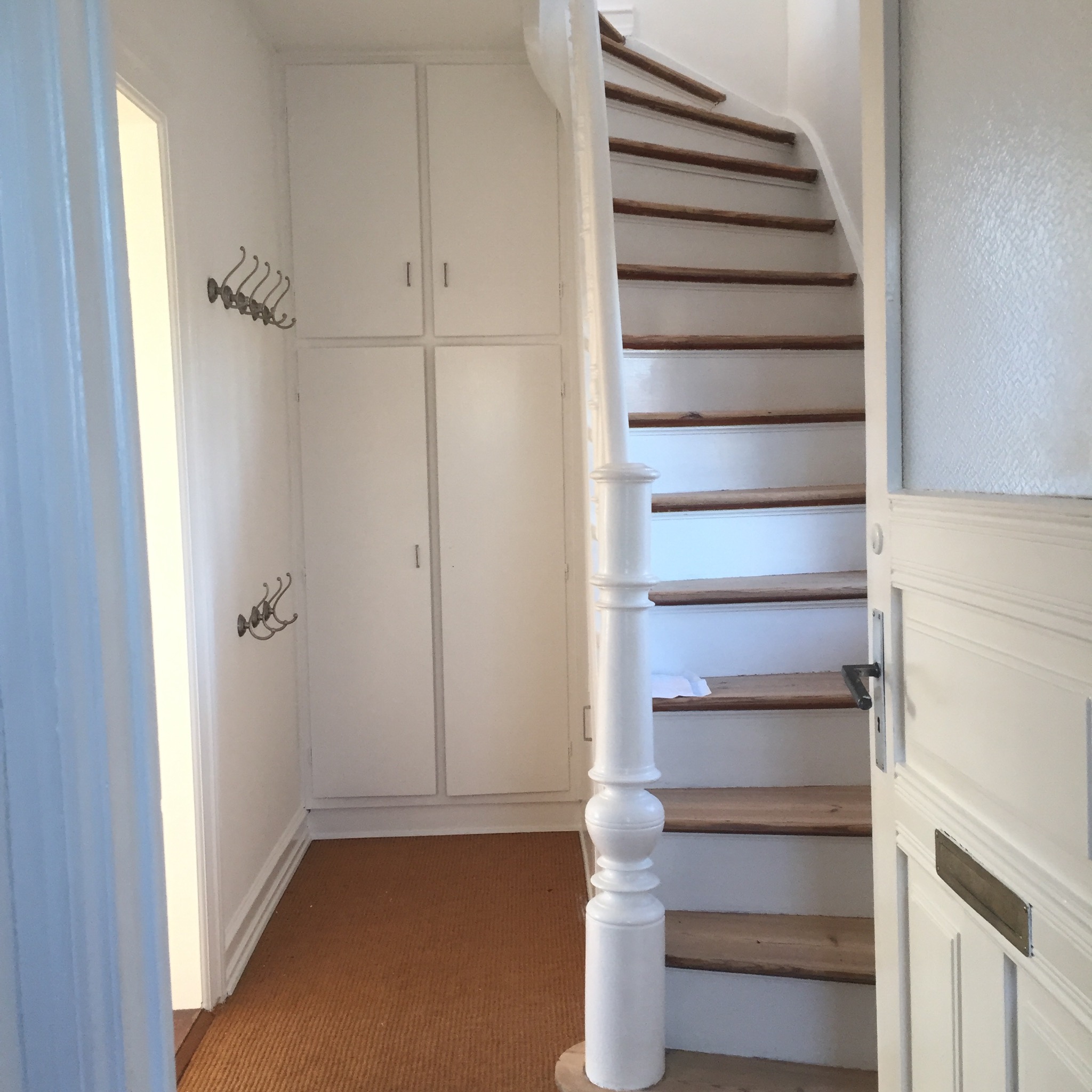 Jeg delte et lignende indlæg omkring vores køkken for et stykke tid siden, hvor jeg netop viste en masse før- og efterbilleder. Nu er det gangens tur, den har nemlig fået en lige så stor omgang. Da vi flyttede ind kom man ind i en egentlig meget lys og fin gang, men med et knap så kønt gulv. Desuden var den ret lille og proppet med skabe. Man gik ned til kældertrappen inde fra køkkenet, og vi ønskede mere plads i vores køkken – hvorfor vi lukkede denne nedgang til. Til gengæld åbnede vi så op ned til trappen fra vores opgang. På den måde kører trappen ligesom hele vejen igennem fra førstesalen og ned til kælderen.