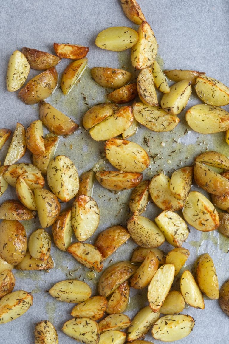 Ovnbagte kartofler med timian, bedste tilbehør til så mange retter. De her råstegte kartofler er sprøde og samtidig bløde inden i. De er dejlig saltede og krydrede og så kan de bare spises til så mange slags retter, kød, fisk mm. Se nedenfor hvor jeg kommer med lidt serveringsforslag.
