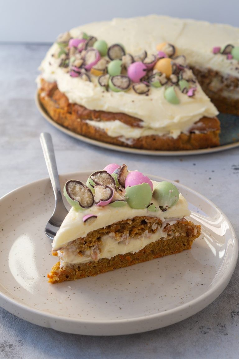 Her er kagen du skal bage i din påskeferie og servere for familie eller venner. Den er lavet på min bedste gulerodskage, en saftig, sød og let krydret bund, som jeg har skåret op – så cremen kan komme ind i mellem og på toppen. Ostecremen er flødeost, citronskal, smør og flormelis. Jeg har desuden pyntet min påskekage af med marcipanfyldte påskeæg, så nemt og så hyggeligt. Jeg synes den emmer af påskestemning og vil derfor passe perfekt i den tid vi går ind i.