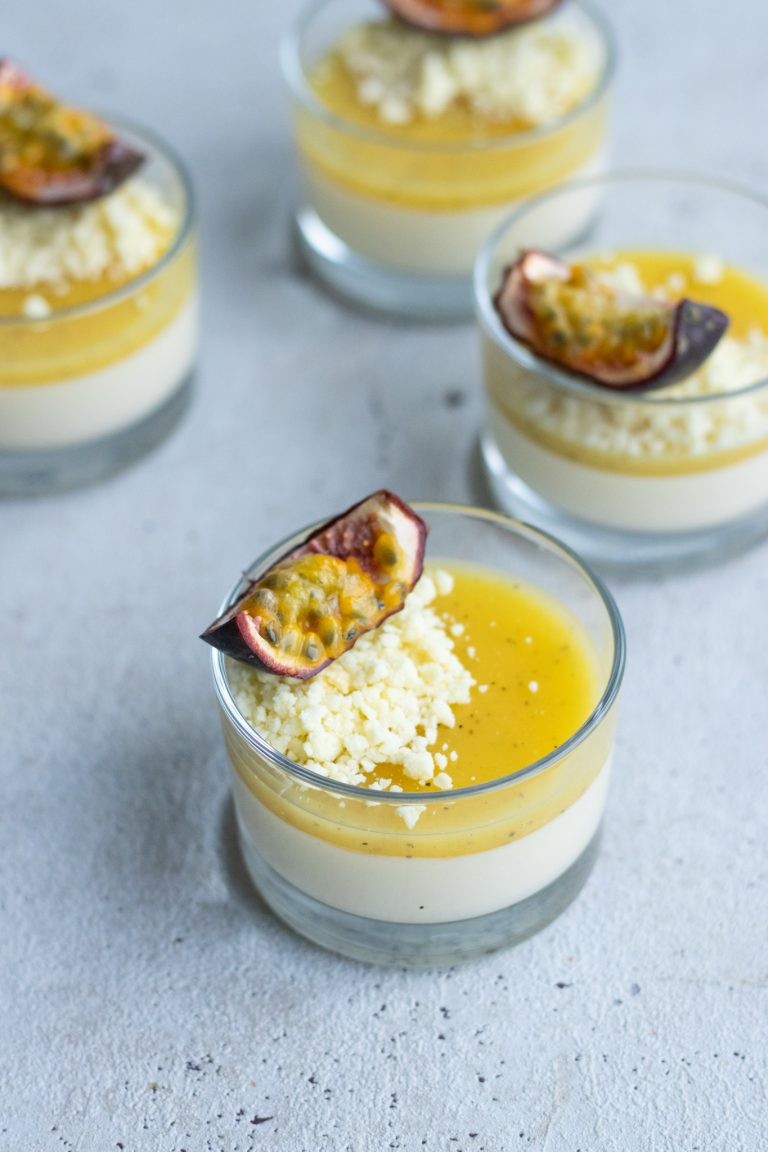 Panna cotta er en nem dessert at lave. Det kræver blot lidt kogetid, og derefter klarer den selv arbejdet i køleskabet. Det samme med mango/passionsfrugt gele’en. Gele’en har en skøn mild og let syrlig smag af mango og passionsfrugt, som bare spiller godt sammen med den søde vanilje bund. Jeg vil anbefale at skrabe kornene ud på desserten, så du får godt med syre i hver en bid – det er bare lige prikken over i’et.