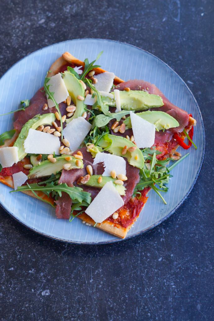 - Den med avocado og store stykker parmesan: den kom jeg revet parmesan, peberfrugt og squash på til en start – som blev bagt i ovnen. Efter den kom ud, kom der bresaola, avocado, rucola, pinjekerner, parmesan i flager og evt. lidt olie, balsamico og/eller flagesalt