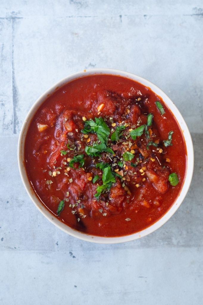 Her er en yderst nem opskrift på pizzsauce eller tomatsauce, som det også kan kaldes. Denne sauce er perfekt til helt klassisk pizza, men den kan også bruges til en masse andet. Du kan f.eks. bruge den i pizzasnegle, hvor du smører den på en pizzabund og kommer f.eks. revet ost og skinkestrimler på. Du kan også bruge den i en pastaret, f.eks. sammen med grøntsager og kødboller, eller vegetariske frikadeller. Jeg har f.eks. en opskrift her.