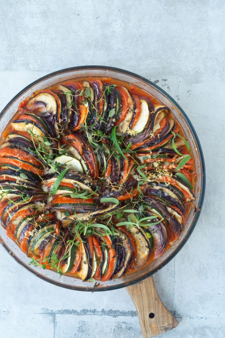 Ratatouille er vegetariske ret, en slags lun salat eller bagt grøntsagsmix. Det består af aubergine, squash, tomater og rødløg som ligger i en krydret tomatsauce. Det hele bages i ovnen med lidt revet ost over og toppes med friske krydderurter. Et rigtig godt tilbehør til alverdens retter, til kød, fisk, til brød og dips osv. Få her min ratatouille opskrift samt en masse serveringsforslag.