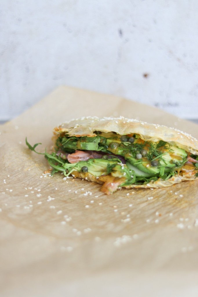 Her finder du en opskrift på en lækker og sprød rispapirswrap med laks og avocado. Måske du tænker, rispapir? Jeg kan ikke se noget rispapir der.. Men du læste rigtigt. Det er rispapir, man vender i pisket æg og lægger i lag med lidt mel-klister. Klap sammen og bag det sprødt. Og så har du simpelthen det mest vanvittige sprøde, nærmest butterdejs lignende “brød” til dine sandwich og wraps.