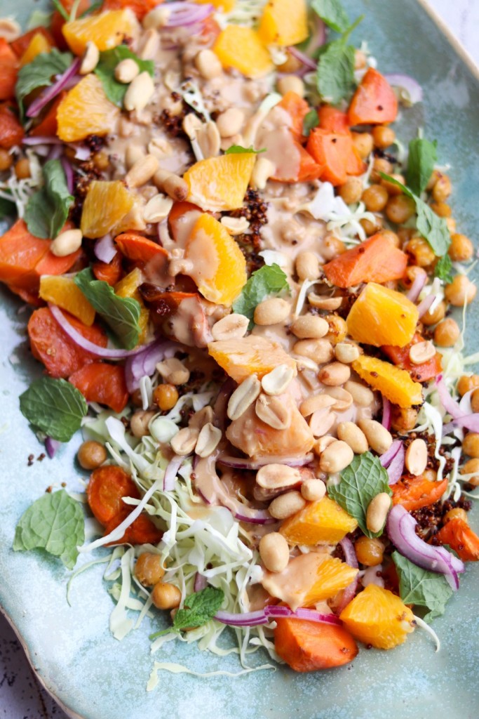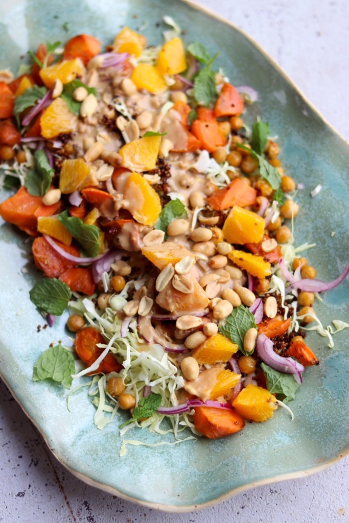 Her kører vi godt med fintsnittet spidskål i bunden. Så har vi en omgang bagte sager (alt på en bageplade): kikærter, kogt quinoa og gulerødder. Lidt olie og soya over og bag det godt sprødt. Så er det bare at toppe med lidt saftige appelsinstykker, blød avocado og stærk rødløg. På med verdens bedste peanutbutterdressing og saltede sprøde peanuts på toppen. Jeg siger jer! – En fuldstændig genial kombination.