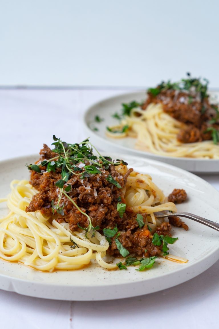 Hvis du ønsker en kødfri bolognese, kan du prøve at lave en linsebolognese. Jeg har et bud på en sauce du kan bruge i indlægget her: vegetarlasagne. Jeg har blot brugt linsebolognesen i en lasagne, men server den meget gerne med en omgang spaghetti i stedet.