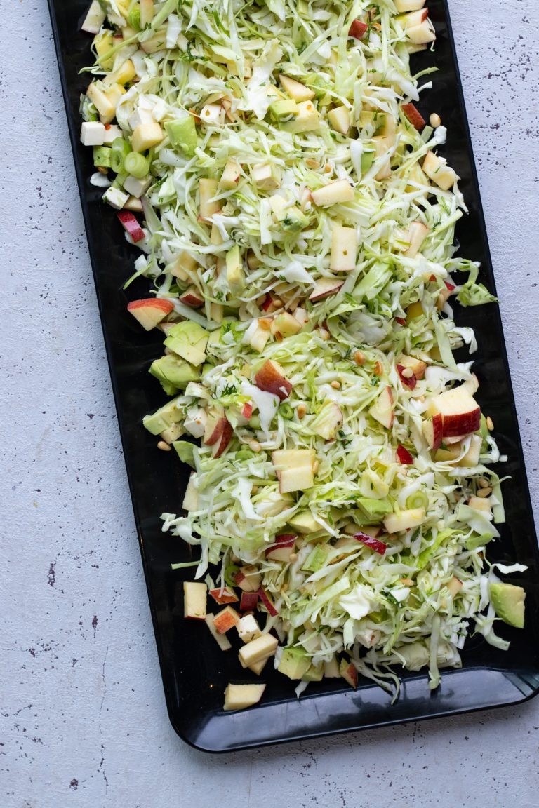 Spidskålssalat, en sindssyg nem og simpel opskrift som vi får igen og igen. Og igen og igen her hjemme. Den smager bare virkelig godt. Kombinationen af spidskål, de syrlige friske æbler, den bløde og cremede avocado (og gerne feta hvis du synes). Den friske dild og de sprøde og salte mandler – det er bare helt genialt. Hvis du vil gøre det en lille smule nemmere, kan du bruge pinjekerner fremfor soyamandler. Så kan du evt. lige riste dem på panden inden de kommer over salaten.