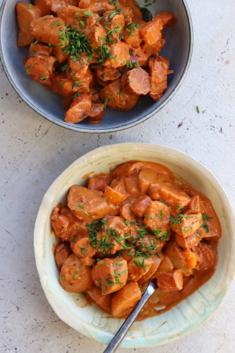 Det er som sagt ganske nemt at lave. Jeg starter med at klargøre det hele, jeg skærer løg, peberfrugt og pølser ud samt skærer kartofler og rodfrugter i tern. Jeg skræller ikke, jeg bruger blot økologiske kartofler og rodfrugter som jeg skyller grundigt inden. Kartofler og rodfrugter koges. Det andet svitses af i smør sammen med de ting der udgør saucen: tomatpuré, sukker, paprika, salt, peber, fløde og balsamico samt kogevand fra kartoflerne. Til sidst kommes de kogte rodfrugter og kartofler i – og så er der mad. Simpelt og hammerlækkert.