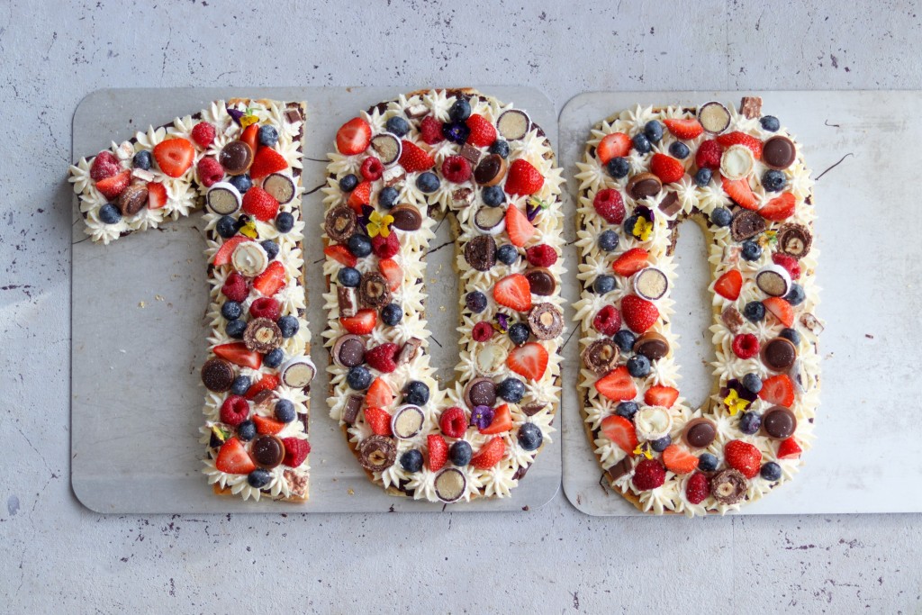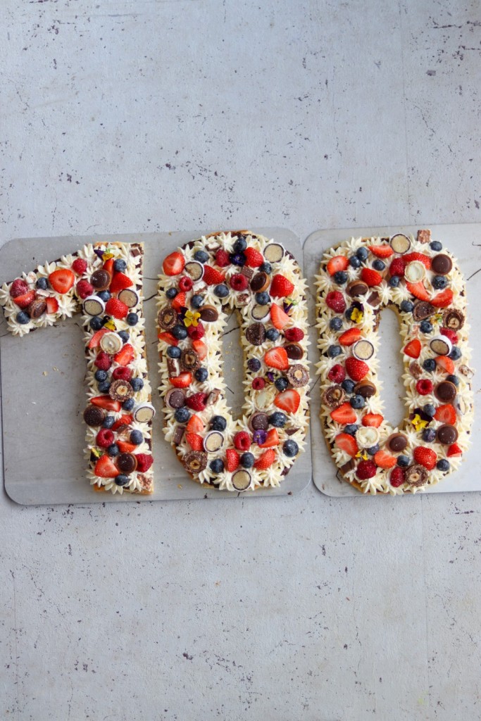 Talkagen her er egentlig min klassiske mazarinkage, men ganget op fire gange, så den kan danne bogstaver eller tal – i mit tilfælde et “100”, fordi jeg ville fejre min 100.000-milepæl.