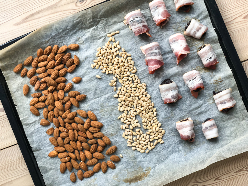 - Dadler i baconsvøb (fjern stenen fra dadlerne og kom bacon omkring dem – bag dem ved 200 grader i cirka 10 minutter)
