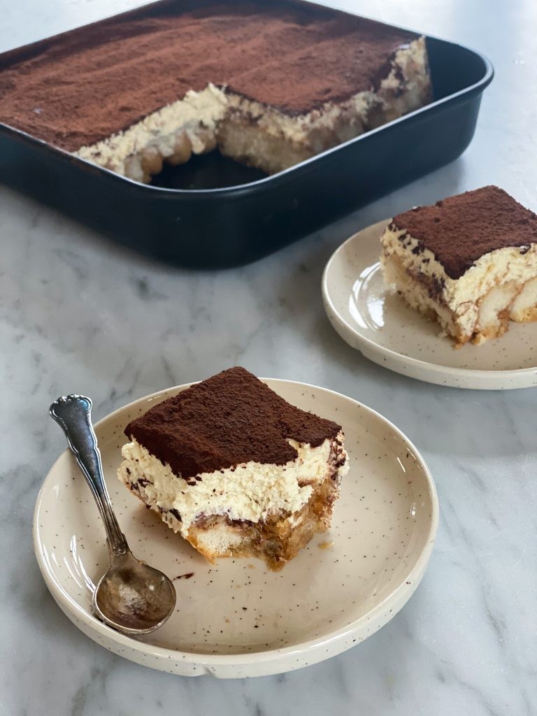 Her er min opskrift på tiramisu, det smager bare så godt sådan en omgang her – og så er det ikke engang særlig svært. Det tager nærmest et kvarters tid at bikse sådan en omgang sammen, og så er det ellers bare at vente på at den trækker nogle timer og bliver endnu bedre. Kagen her giver 20 mindre stykker (som på billedet), jeg ville sige den rækker til 8-10 personer. Sæt en kande kaffe over og byd dine gæster på hjemmelavet tiramisu.