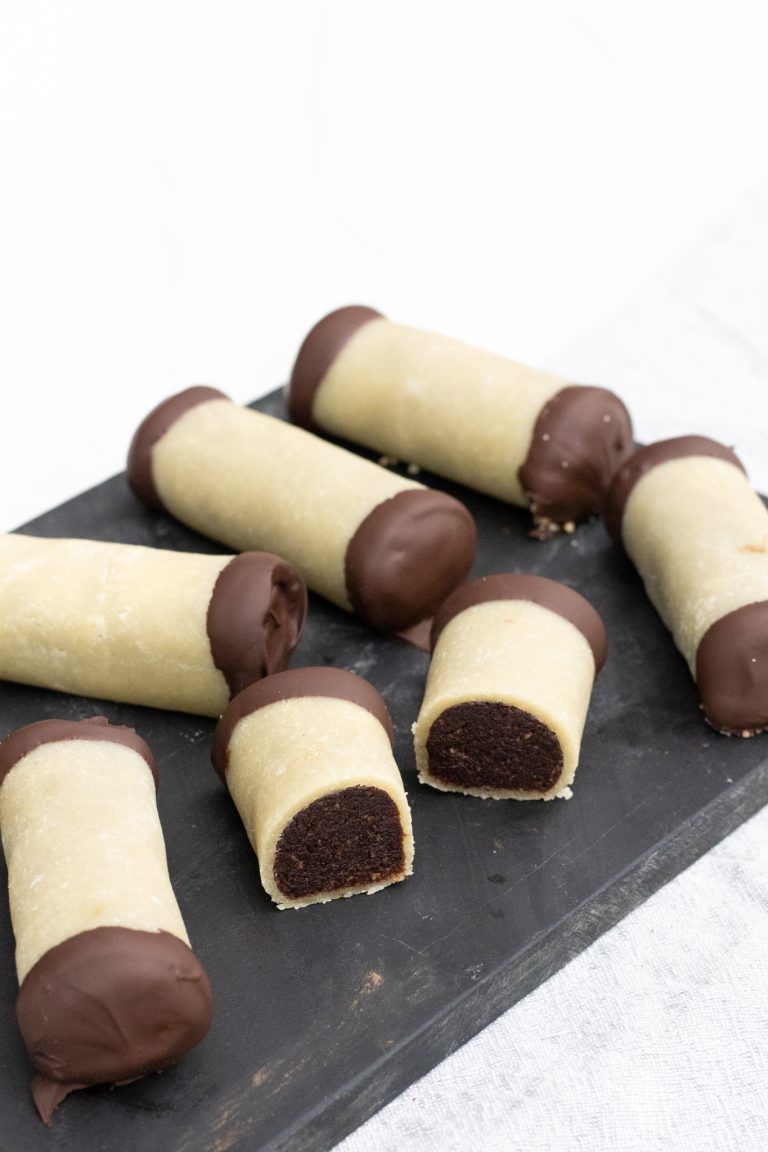 Jeg rullede marcipanen tyndt ud, så den rakte til en del. Desuden kom jeg ikke marcipan i enderne da de jo alligevel dækkes med chokolade. Men det kan da godt være at jeg, for at være på den sikre side – skal sætte mængden af marcipan lidt op i opskriften. Håber de ellers smagte rigtig godt 😀