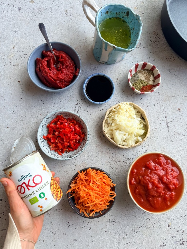 Her finder du en opskrift på en linse bolognese, sådan en fyldig og lækker omgang bolo med masser af smag. Den kan varieres ift. grøntsager, ift. krydderier og ift om du vælger grønne eller røde linser. Her er min variant, som jeg synes er virkelig god. Men jeg kommer med bud på de her justeringer nedenfor. Se også en video der viser hvor nemt det er.