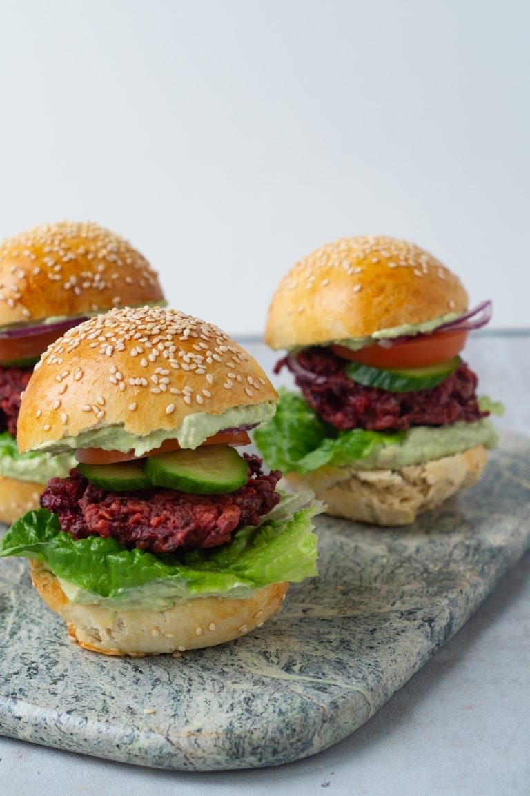 Denne her opskrift på vegetarburger er både nem, hurtig og virkelig god. Selve bollerne er de her bløde og smørfyldte briocheboller, som jeg elsker virkelig meget. Her kan du dog sagtens lave en grovere variant. Du kan f.eks. bruge min opskrift på grovboller med masser af kerner. Du kan også lave en glutenfri variant eller lave dig en lidt grønnere bolle. Så kommer dippen, hvor jeg har brugt en guacamole. Selve bøffen er en rødbedebøf, som er dejlig saftig og krydret. Jeg håber I kan lide opskriften på vegetarburger med rødbedebøffer.
