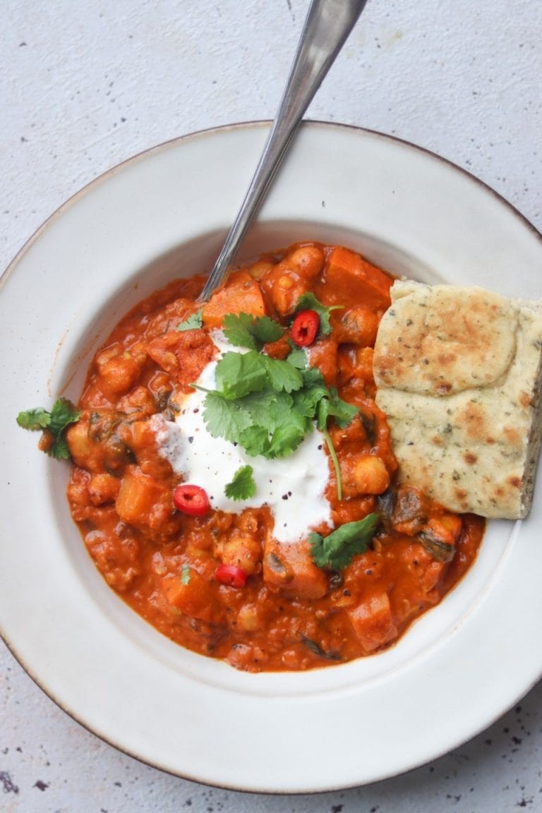 Den er nærende og mættende, den her vegetariske curry med græskar. Der er nemlig både linser og græskar i. Og så kan du servere et stykke naanbrød til, hvis du synes. Jeg toppede desuden med en klat creme fraiche, lidt friske koriander og frisk chili.