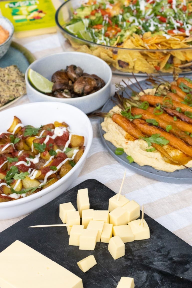 Vegetarisk tapas med nachosfad, patatas braves (en form for kartofler med dip), humus, falafler, haydari, hjemmebagte knækbrød, friturestegte broccoli fritter og veganske oste. Jeg har teamet op med Bel (reklame), der står bag disse veganske plantebaserede oste og nu har jeg brugt dem som en del af denne vegetariske tapas.