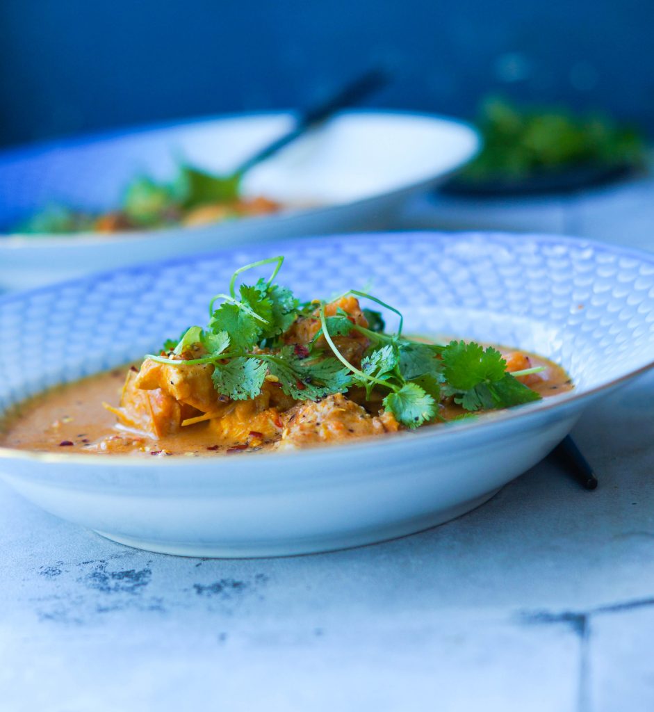 Jeg har tilladt mig at ændre lidt i opskriften, jeg har skiftet kyllingelår ud med kyllingebryst (da jeg bedre kan lide det), og brugt en smule mindre chili, da jeg ikke er til vildt stærk mad. Desuden har jeg brugt vand frem for hønsekødssuppe (for at gøre det mere simpelt). Opskriften oven for er altså ikke helt identisk med den i bogen.