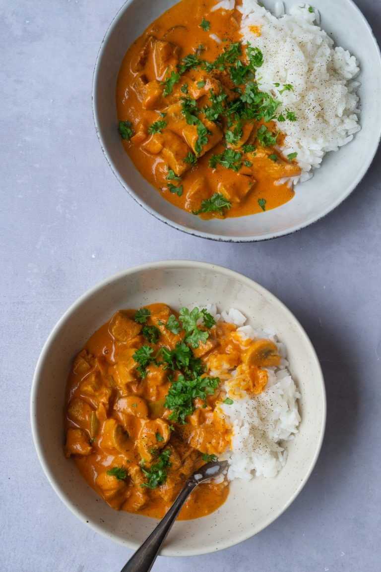 • Serveringsmæssigt kan du servere til pasta frem for ris, til fuldkornsris eller havreris fremfor de hvide ris. Du kan servere til kartofler eller kartoffelmos, til bagte blomkål eller blomkålsris. Igen er der masser af muligtheder. Her hjemmeforetrækker manden og ungerne at der er en form for stivelse, som pasta, ris eller kartofler. Personligt er bagte blomkål lige så godt for mig. Jeg elsker dem.
